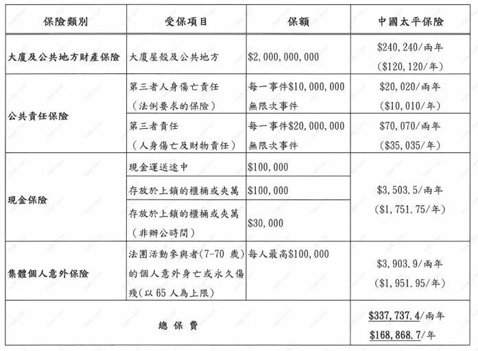 经商议后,继续向“中国太平保险(香港)有限公司”投保,投保期为2025年1月1日至2026年12月31日。具体来看,保险方案包括大厦及公共地方财产保险、公共责任保险、现金保险和集体个人意外保险。