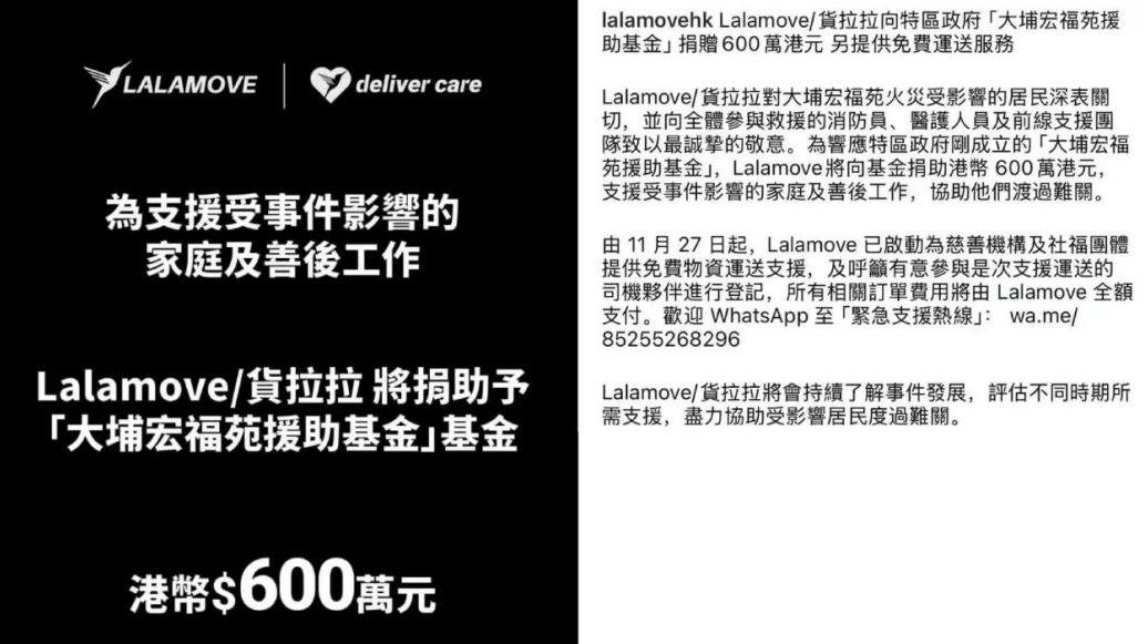 11月28日,货拉拉(Lalamove)宣布向香港特区政府成立的“大埔宏福苑援助基金”捐助600万港元,支援受灾家庭及善后工作。