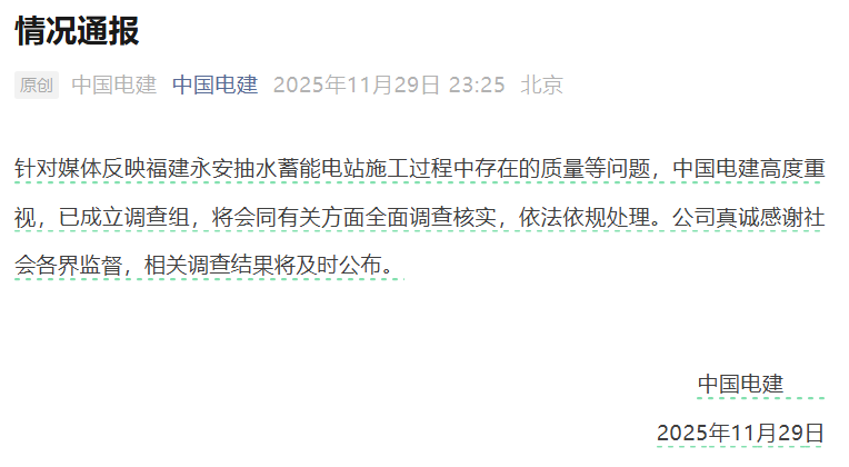 11月29日深夜,中国电建发布情况通报,回应媒体反映福建永安抽水蓄能电站施工过程中存在的质量等问题。中国电建称,公司对该事件高度重视,已成立调查组,将会同有关方面全面调查核实,依法依规处理。相关调查结果将及时公布。