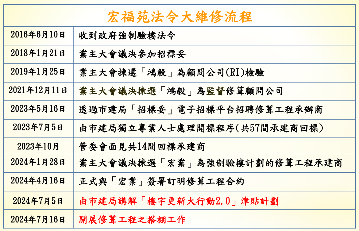 2016年6月10日,彼时房龄33年的宏福苑收到政府的强制验楼法令,在经过长达8年的招标程序后,于2024年与宏业建筑工程有限公司签署了“大维修”工程的合同。