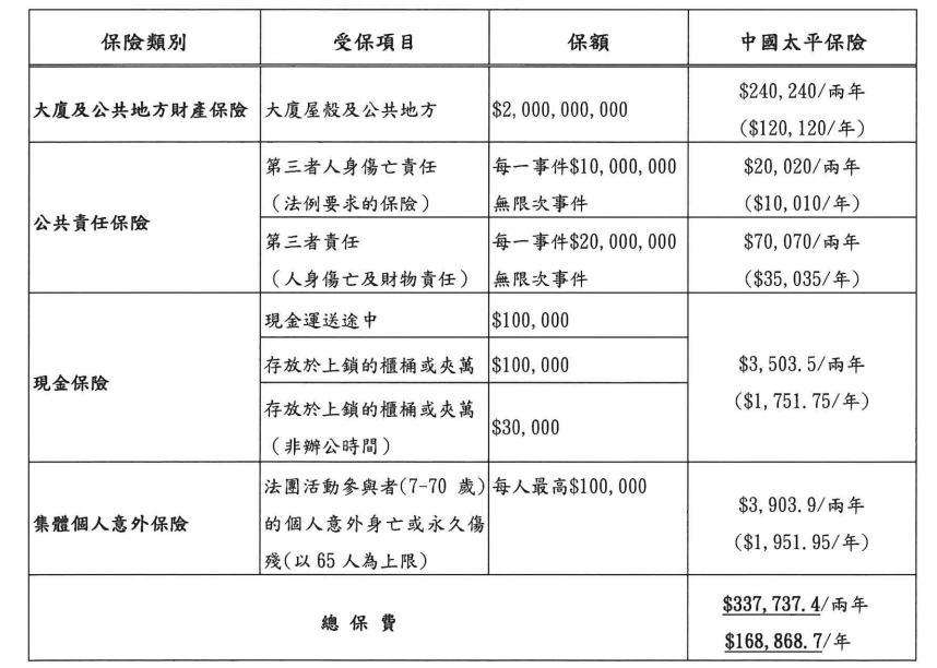 值得留意的是,尽管“大维修”工程已然启动,但仅有的报价方太平香港,依旧给出了与之前相同价格的报价;此外,另一份公开文件还显示,太平香港同时承保了宏业建筑工程有限公司的责任险,理赔金额最高可达3.66亿港元;以及每次事故最高可达2亿港元的雇员赔偿保险,保单有效期为2024年7月至2027年7月。