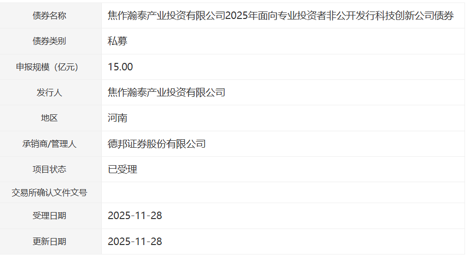 【大河财立方消息】12月1日消息,焦作瀚泰产业投资有限公司2025年面向专业投资者非公开发行科技创新公司债券项目,已获深交所受理。