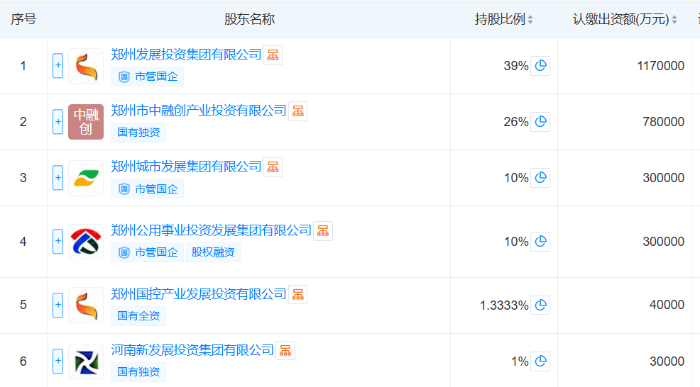 天眼查显示,今年9月22日,郑州国创产投更名成立,注册资本300亿元,股东包括郑州发展投资集团有限公司、郑州市中融创产业投资有限公司、郑州城市发展集团有限公司、郑州公用事业投资发展集团有限公司等25家单位。