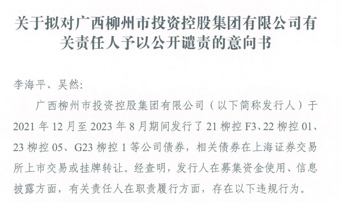 【大河财立方消息】12日1日消息,上交所拟对广西柳州市投资控股集团时任董事长、总经理李海平,时任财务负责人、信息披露事务负责人吴然予以公开谴责。
