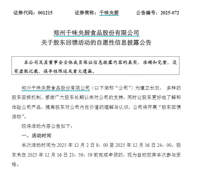 千味央厨表示,12月1日下午收市时在中国结算深圳分公司登记在册的持有公司股份100股(含)以上的股东,可以参与本次股东回馈活动。