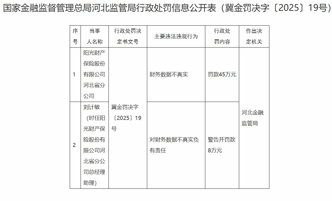 同时,河北金融监管局对时任阳光财产保险股份有限公司河北省分公司总经理助理刘计敏警告并罚款8万元。