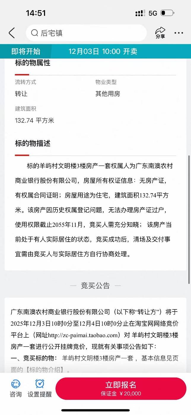 例如,广东南澳农村商业银行挂牌的汕头南澳县一处房产,面积132.74平方米,售价仅16.1万元。在标的物描述中,该房产因历史权属登记问题,无法办理房产证过户,使用权限截至2055年11月,该房产当前处于有人实际居住的状态,竞买成功后,清场及交付事宜需由竞买人与实际居住方自行协商处理。该行工作人员对记者表示,由于历史原因,目前房中有退休老人居住,拍下需要自行协商。建议购买要慎重。
