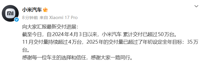 【大河财立方消息】12月2日,小米汽车宣布,截至2025年12月2日,自2024年4月3日以来,累计交付已超过50万台。今年11月交付量持续超过4万台,2025年的交付量已超过了年初设定全年目标35万台。