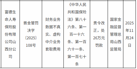 【大河财立方消息】12月2日,国家金融监督管理总局山西监管局披露的行政处罚信息显示,因财务业务数据不真实、虚构中介业务套取费用,富德生命人寿保险股份有限公司山西分公司(简称富德生命人寿山西分公司)被责令改正,并处罚款26万元。