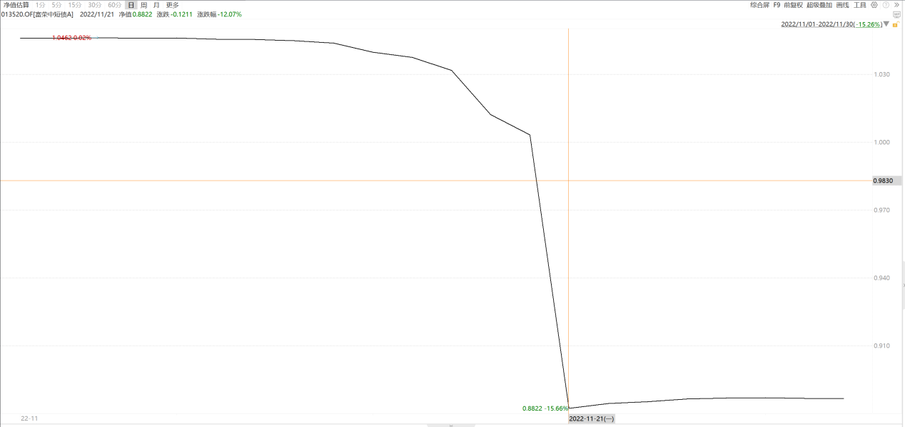 当年11月21日,富荣基金的富荣中短债单日暴跌12.07%,直到今天仍旧未能“收复失地”。该基金在2022年三季报披露,重仓了一只地产企业发行的资产支持证券,而这只产品在第四季度一度跌幅接近50%。在持仓暴雷、赎回压力增加的双重压力下,富荣中短债始终没有缓过神。