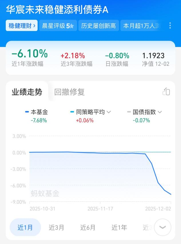 数据显示,这只债券型基金华宸未来稳健添利的净值,从11月25日开始至今连续呈负收益,分别为-0.06%、-0.08%、-1.77%、-3.56%、-1.48%、-0.80%。