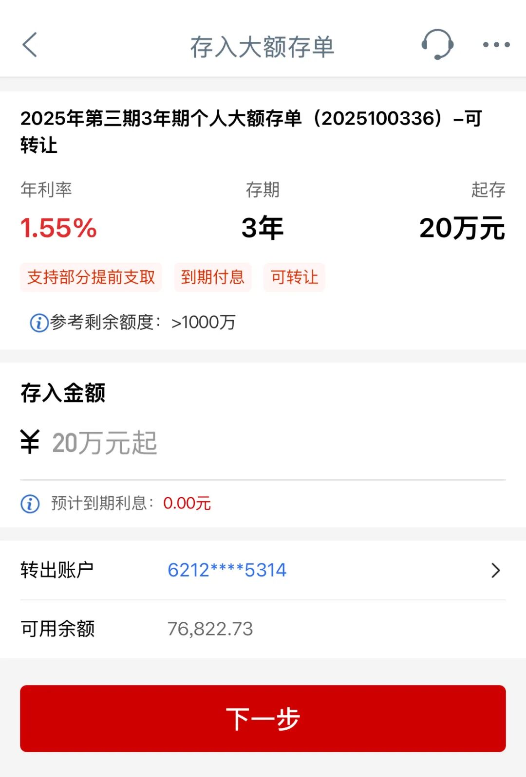 记者登录工商银行手机银行APP查询证实,在“大额存单”栏目中,2025年第三期3年期产品清晰标注“20万起存,年利率1.55%,参考剩余额度>1000万元”,购买流程顺畅;而第四期产品已显示“售罄”状态,无法购买。对比发现,两款产品除了起存金额不同外,在计息规则、提前支取条款等核心要素上均保持一致,且均具备可转让、可质押的大额存单核心属性。