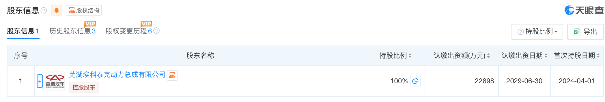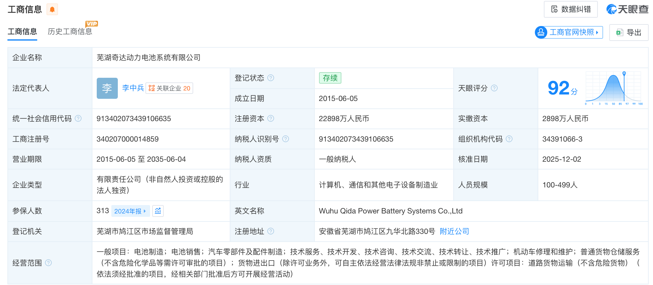 该公司成立于2015年6月,注册资本约2.3亿元人民币,经营范围含电池制造、电池销售、汽车零部件及配件制造、机动车修理和维护、普通货物仓储服务、货物进出口等。股东信息显示,该公司由奇瑞汽车旗下芜湖埃科泰克动力总成有限公司全资持股。