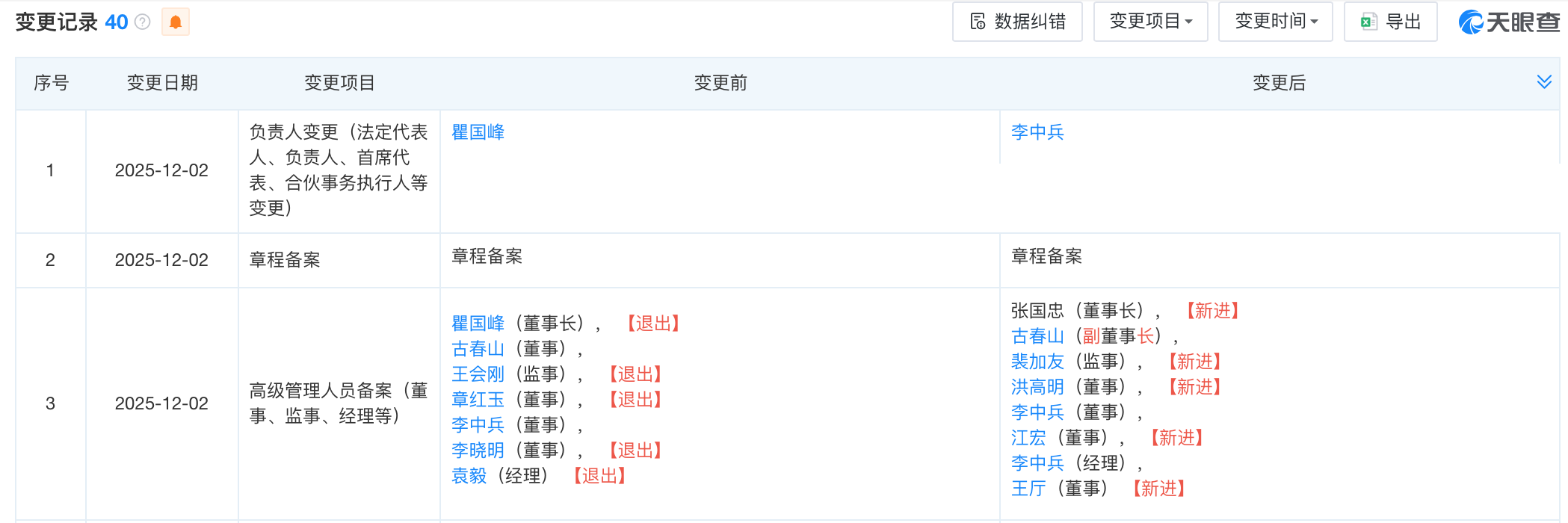 【大河财立方消息】12与4日,天眼查工商信息显示,近日,芜湖奇达动力电池系统有限公司发生工商变更,瞿国峰卸任法定代表人、董事长,由李中兵接任法定代表人,张国忠接任董事长,同时,多位高管发生变更。