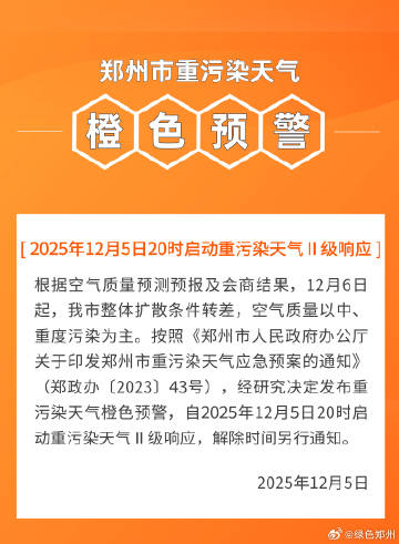 根据空气质量预测预报及会商结果,12月6日起,郑州市整体扩散条件转差,空气质量以中、重度污染为主。按照《郑州市人民政府办公厅关于印发郑州市重污染天气应急预案的通知》(郑政办〔2023〕43号),经研究决定发布重污染天气橙色预警,自2025年12月5日20时启动重污染天气Ⅱ级响应,解除时间另行通知。