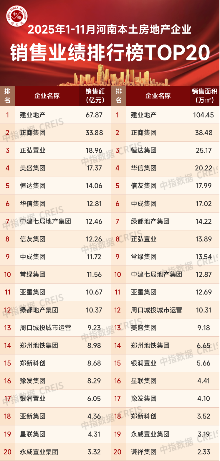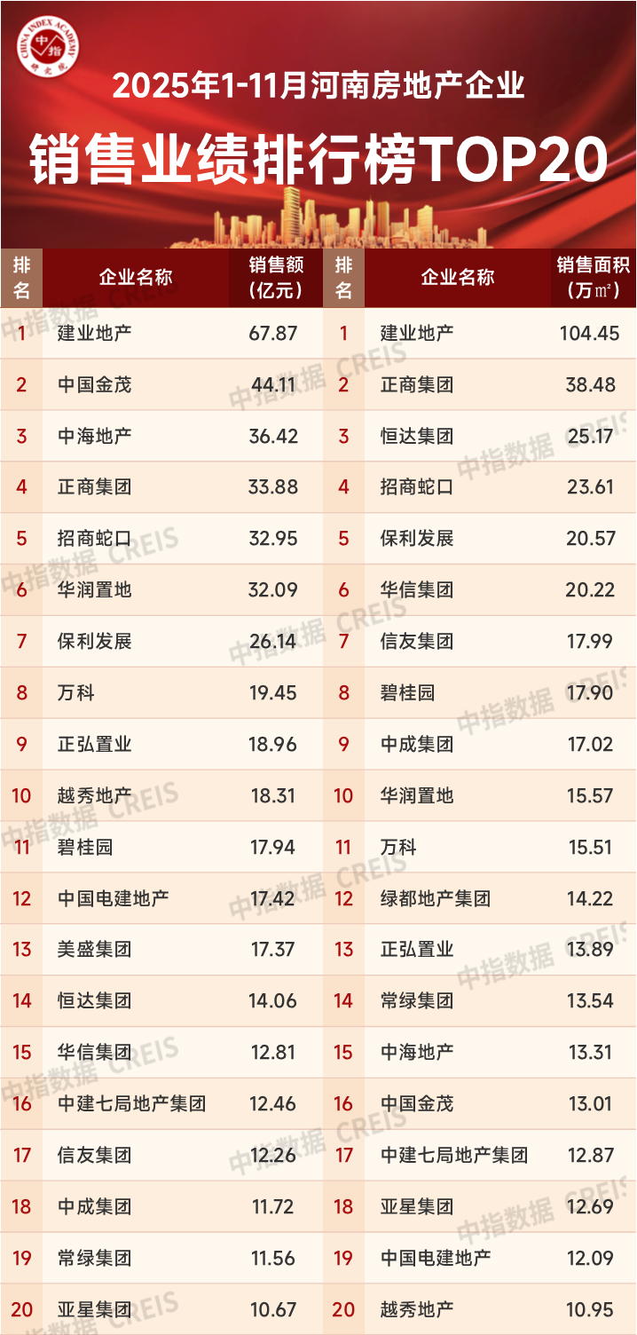 【大河财立方消息】12月5日,中指研究院发布2025年1~11月河南省房地产企业销售业绩TOP20榜单。
