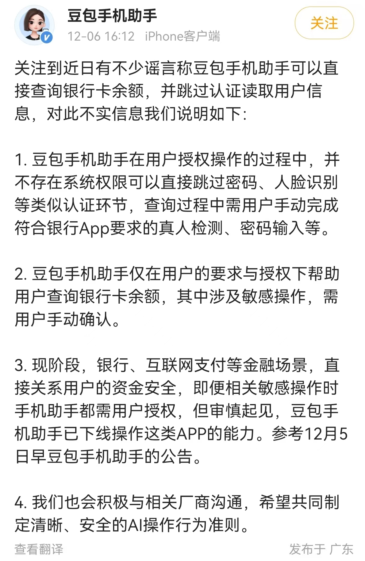 【大河财立方消息】12月6日,豆包手机助手发文称,关注到近日有不少谣言称豆包手机助手可以直接查询银行卡余额,并跳过认证读取用户信息,对此不实信息说明如下: