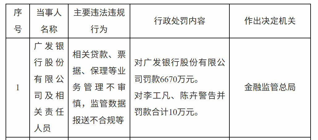 今年9月,国家金融监督管理总局披露行政处罚信息,因相关贷款、票据、保理等业务管理不审慎,监管数据报送不合规等,广发银行被罚款6670万元。