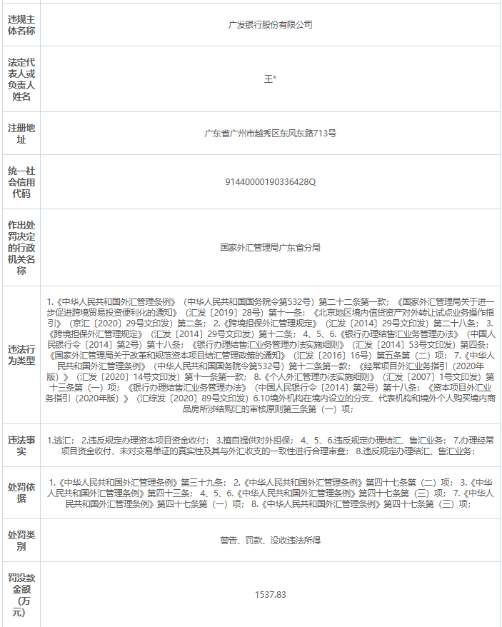 行政处罚信息显示,广发银行此次涉及8项违法事实:逃汇;违反规定办理资本项目资金收付; 擅自提供对外担保;违反规定办理结汇、售汇业务;办理经常项目资金收付,未对交易单证的真实性及其与外汇收支的一致性进行合理审查; 违反规定办理结汇、售汇业务。