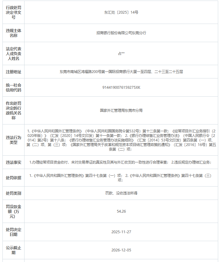 【大河财立方消息】12月8日消息,国家外汇管理局广东省分局日前公示的行政处罚信息显示,招商银行股份有限公司东莞分行被罚款、没收违法所得54.26万元。