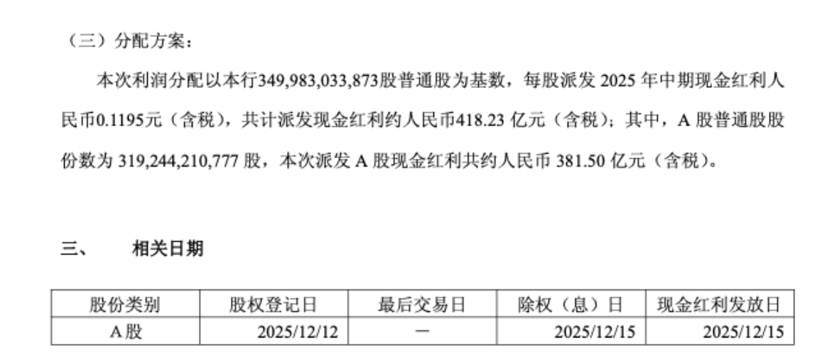 其中,农业银行派发A股现金红利共约人民币381.50亿元(含税)。股权登记日为2025年12月12日,除权(息)日和现金红利发放日均为2025年12月15日。