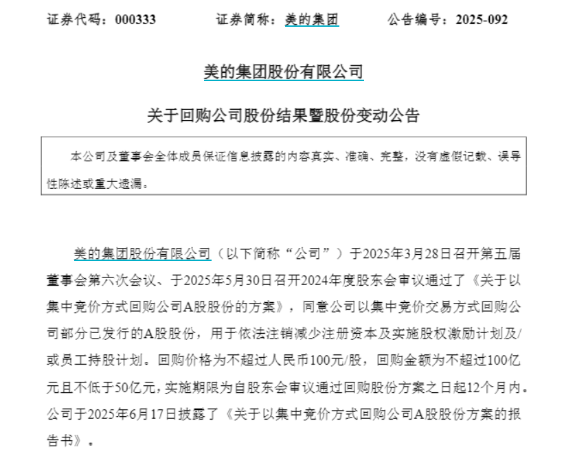 【大河财立方消息】12月8日,美的集团发布公告称,截至2025年12月8日,公司累计回购股份数量约为1.35亿股,占公司总股本的1.76%,最高成交价为83.11元/股,最低成交价为69.91元/股,支付的总金额约为100亿元(不含交易费用)。综上,公司本次回购股份金额已达回购方案的金额上限100亿元,本次回购方案实施完毕。