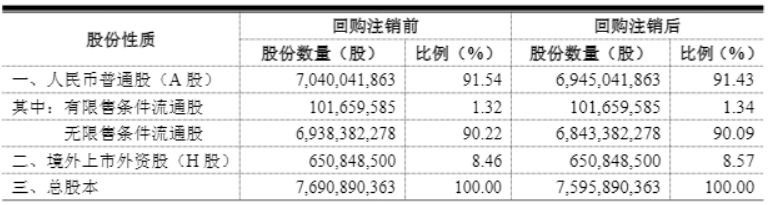 美的集团表示,根据本次回购方案,回购股份70%及以上将用于注销并减少注册资本。公司本次累计回购股份1.35亿股,其中9500万股将予以依法注销减少注册资本,注销股份占注销前总股本比例为1.24%。按照目前公司股本结构计算,本次股份回购注销后可能带来的变动情况如下: