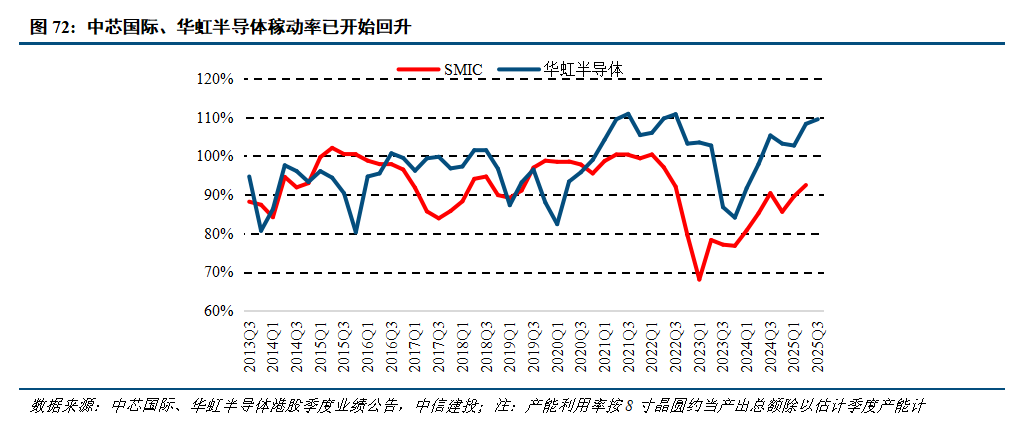 国内主要Fab厂已进入稼动率回升阶段。2022年以前国内Fab厂稼动率波动相对较小,中芯国际和华虹半导体季度平均稼动率分别为94.3%、95.7%,进入2022年,智能手机和PC等消费电子需求收缩,叠加产业链在2022年过度囤货导致需求透支,所以在全球半导体行业去库存进程中Fab厂稼动率降幅较大,中芯国际、华虹半导体稼动率分别于2023Q1、2023Q4触底,历史最低稼动率分别为68.1%、84.1%,伴随行业去库接近尾声,国内主要Fab厂稼动率已进入回升通道,以华虹半导体为例,2025Q3其产能利用率已接近历史峰值水平。