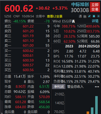 光模块板块内,德科立上涨超18%,太辰光涨超8%。中际旭创再度上涨超过5%,股价盘中超过600元,再创历史新高,最新总市值超过6600亿元。新易盛涨超4%,仕佳光子涨超3.5%。
