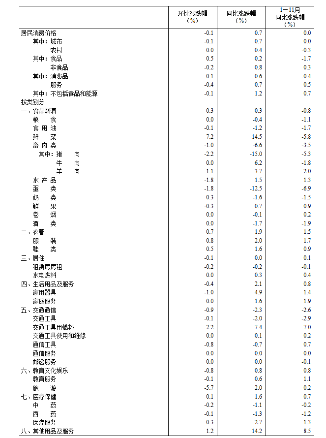11月份,全国居民消费价格环比下降0.1%。其中,城市下降0.1%,农村持平;食品价格上涨0.5%,非食品价格下降0.2%;消费品价格上涨0.1%,服务价格下降0.4%。
