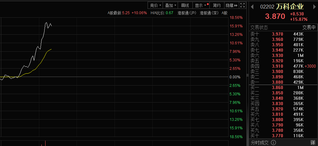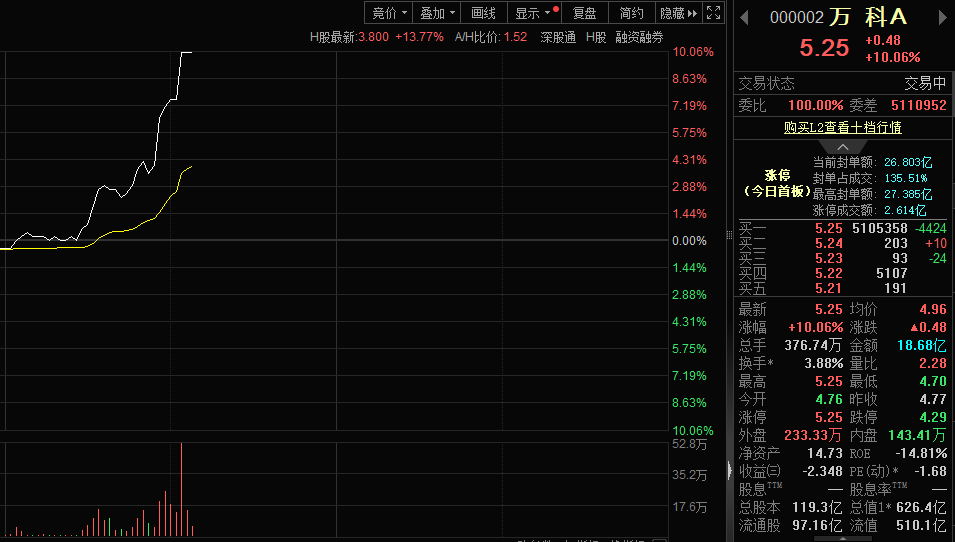 【大河财立方消息】12月10日午后,地产股异动。万科A拉升至涨停板,封单额超26亿元。