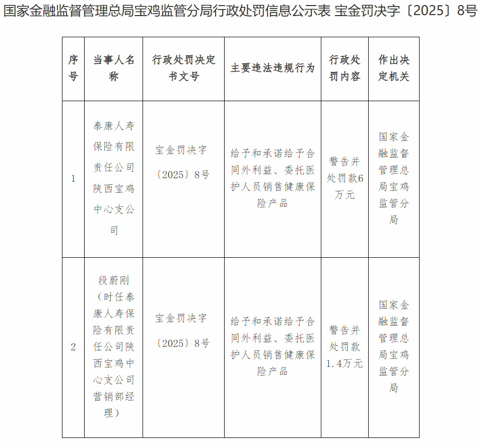 同时,国家金融监督管理总局宝鸡监管分局对时任泰康人寿保险有限责任公司陕西宝鸡中心支公司营销部经理段蔚刚警告,并处罚款1.4万元。