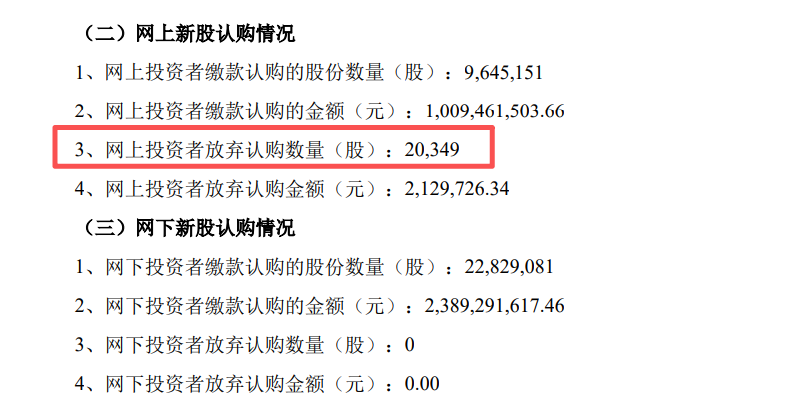 网下投资者缴款认购的股份数量为2282.91万股,缴款认购的金额为23.89亿元,放弃认购数量0股。