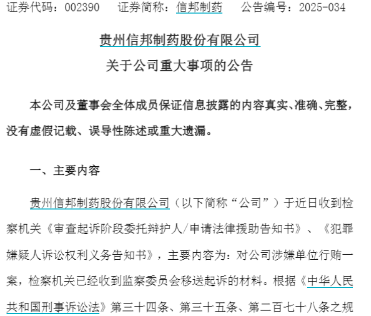 【大河财立方消息】12月10日晚间,贵州信邦制药股份有限公司(证券简称:信邦制药)发布公告称,近日收到检察机关《审查起诉阶段委托辩护人/申请法律援助告知书》、《犯罪嫌疑人诉讼权利义务告知书》,主要内容为:对公司涉嫌单位行贿一案,检察机关已经收到监察委员会移送起诉的材料。