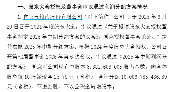 五粮液公告称,公司于2025年6月20日召开2024年度股东大会,审议通过《关于提请股东大会授权董事会制定2025年中期分红方案的议案》,同意授权董事会论证、制定并实施2025年中期分红方案。公司召开第七届董事会2025年第6次会议,审议通过《2025年中期利润分配方案》,同意以公司现有总股本38.82亿股为基数,向全体股东每10股派现金25.78元(含税),合计分配100.07亿元(含税),不送红股,不以公积金转增股本。股权登记日为2025年12月17日,除权除息日为2025年12月18日。
