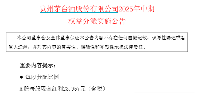 贵州茅台公告称,公司2025年中期利润分配方案已获股东大会通过,将以总股本12.52亿股为基数,每股派发23.957元现金红利(含税),共计派发300.01亿元(含税)。股权登记日为2025年12月18日,除权(息)日和现金红利发放日均为2025年12月19日。