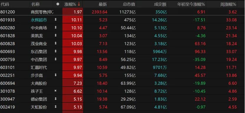8只商贸零售个股涨停,包括永辉超市、中央商场、美凯龙等。