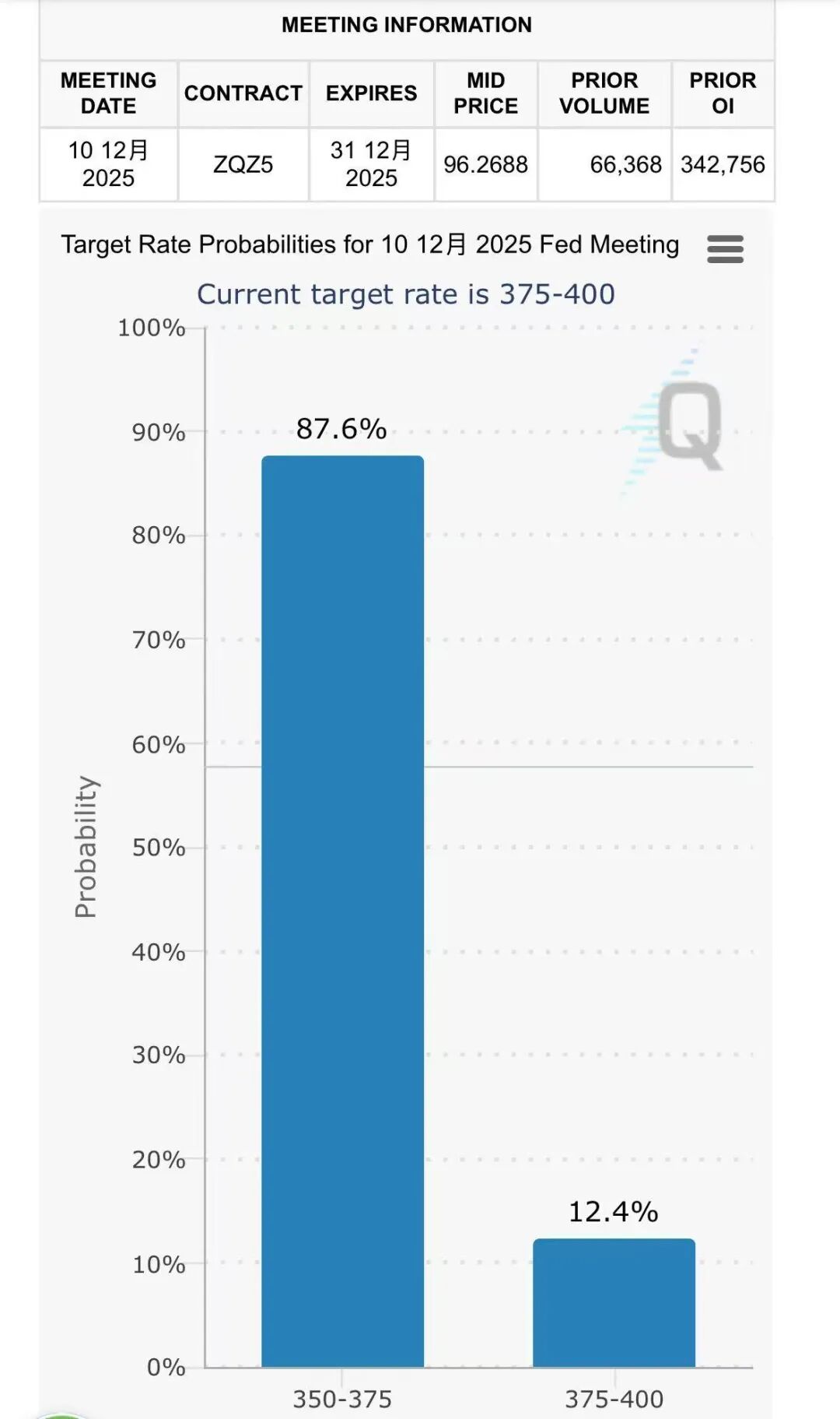此次降息符合市场预期。芝商所FedWatch工具显示,美联储降息25基点的概率达87.6%,维持不变的概率为12.4%。
