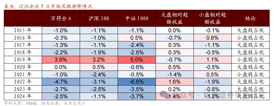 从过去10年会后市场表现来看,会后7天大盘风格往往相对占优。尤其是近5年来看,4次均是大盘风格相对占优。