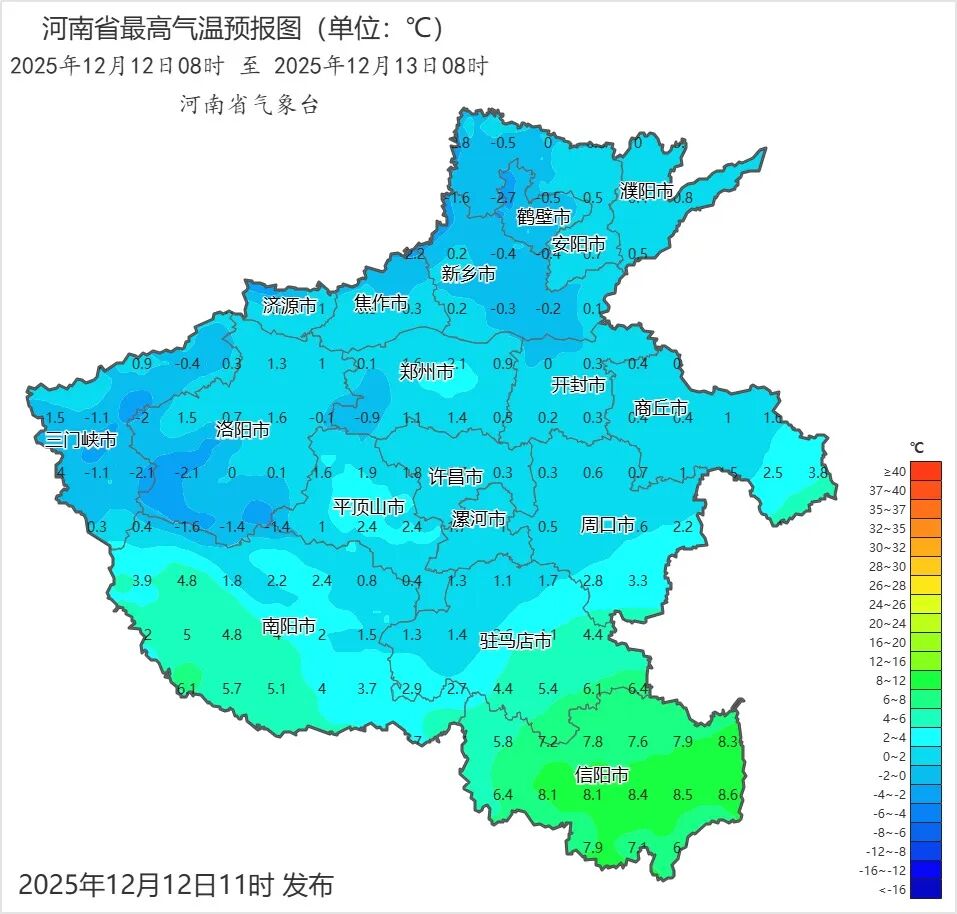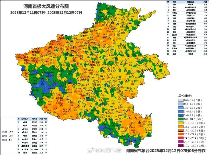 伴随着强冷空气抵达河南,12月11日7时至12日7时,全省大部地区出现6到7级极大风,新乡、焦作、济源、三门峡、洛阳、郑州、许昌、南阳等地局部8到10级。