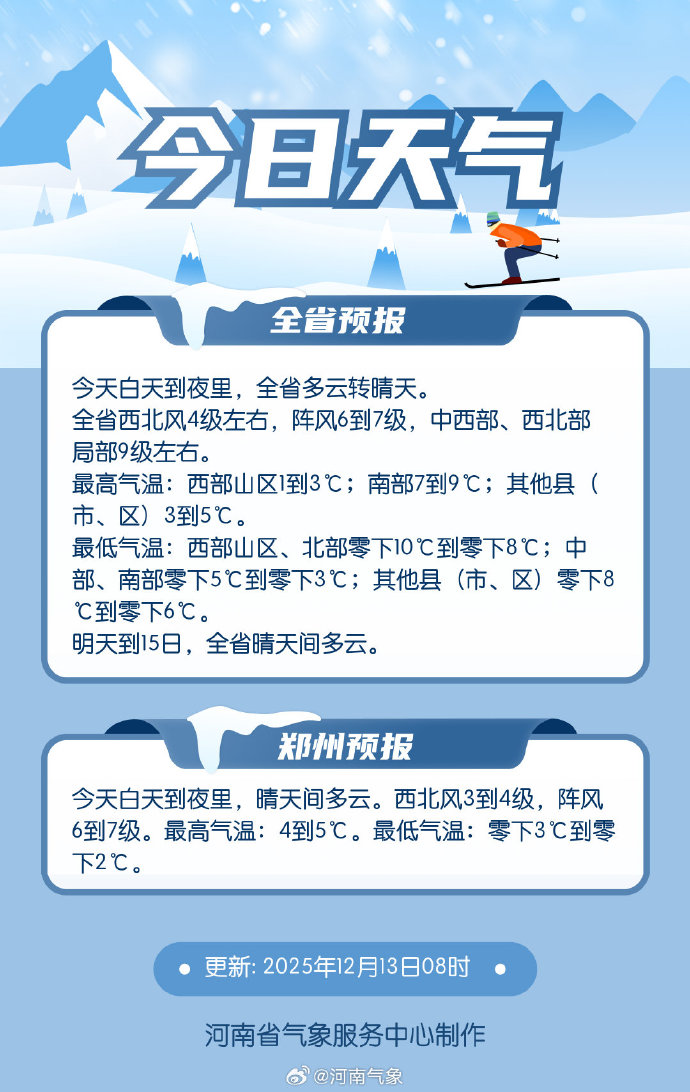 此外,郑州市气象台2025年12月13日8时45分继续发布道路结冰黄色预警信号:受积雪和低温影响,预计未来24小时内,郑州市主城区、航空港区、上街区所辖乡镇及街道路表温度低于0℃,将出现对交通有较大影响的道路结冰,请注意防范。