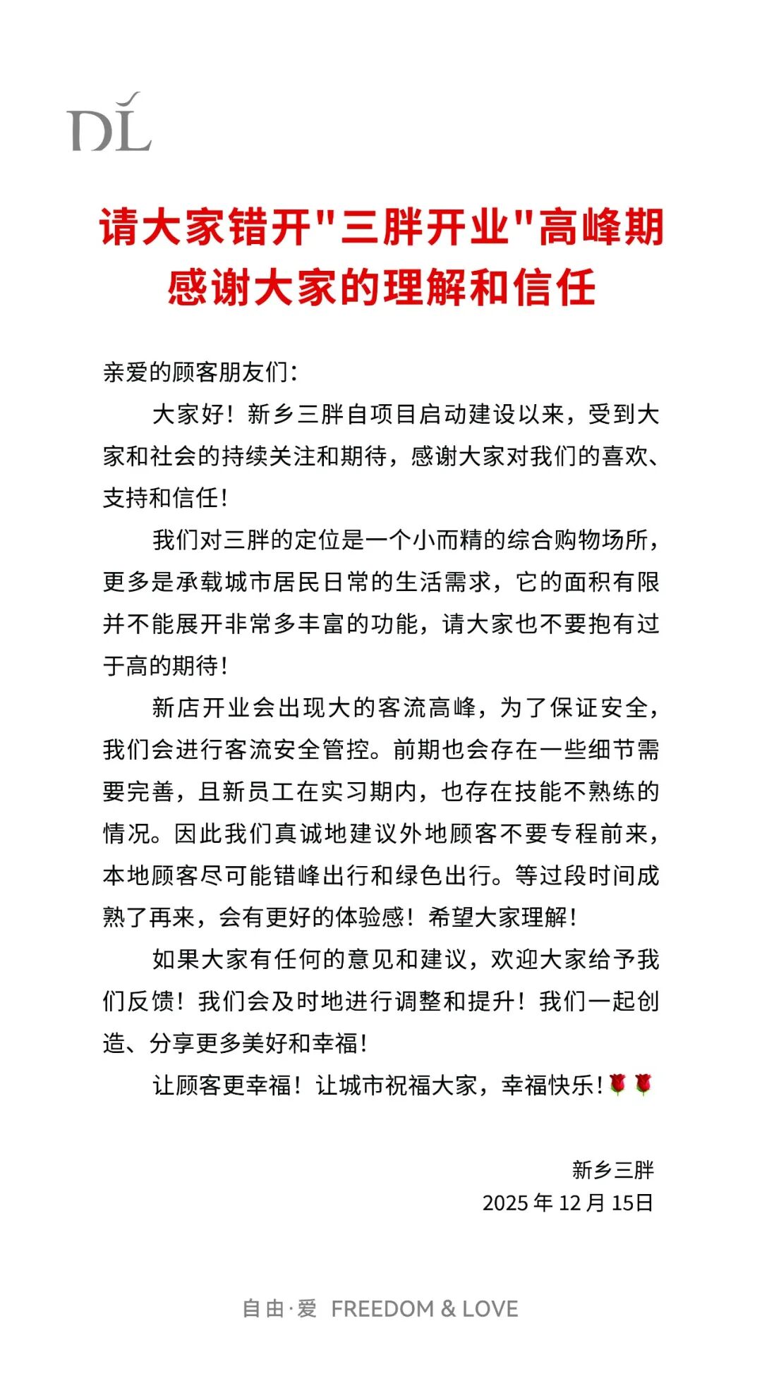 【大河财立方消息】12月15日,新乡胖东来第三家门店(以下简称新乡三胖)发文称,该门店的定位是一个小而精的综合购物场所,更多是承载城市居民日常的生活需求,它的面积有限,并不能展开非常多丰富的功能,请大家不要抱有过于高的期待。