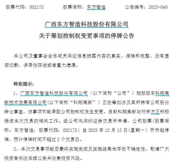 【大河财立方消息】12月15日,广西东方智造科技股份有限公司(证券简称:东方智造)发布公告称,控股股东科翔高新技术发展有限公司(简称:科翔高新)正在筹划涉及其所持有公司股份转让事宜,该事项可能导致公司控制权发生变更。公司股票自12月15日开市起停牌,预计停牌时间不超过2个交易日。