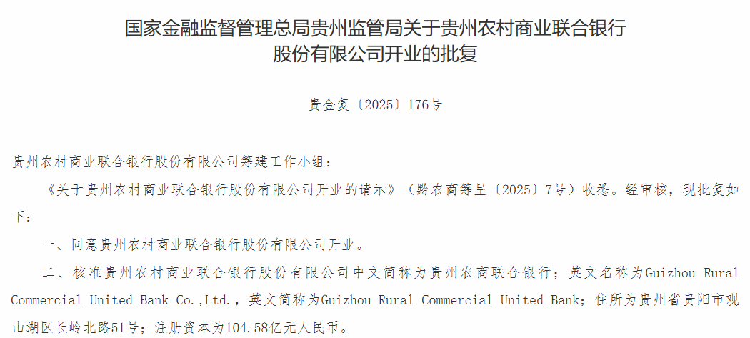 批复文件还提到,贵州农商联合银行开业之日,原贵州省农村信用社联合社自行终止,其债权债务由贵州农商联合银行承继。