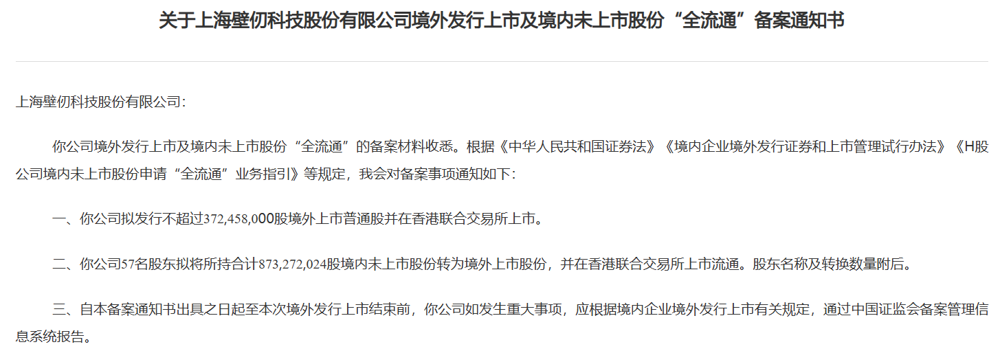 【大河财立方消息】12月15日,证监会网站披露上海壁仞科技股份有限公司(以下简称壁仞科技)境外发行上市及境内未上市股份“全流通”备案通知书。
