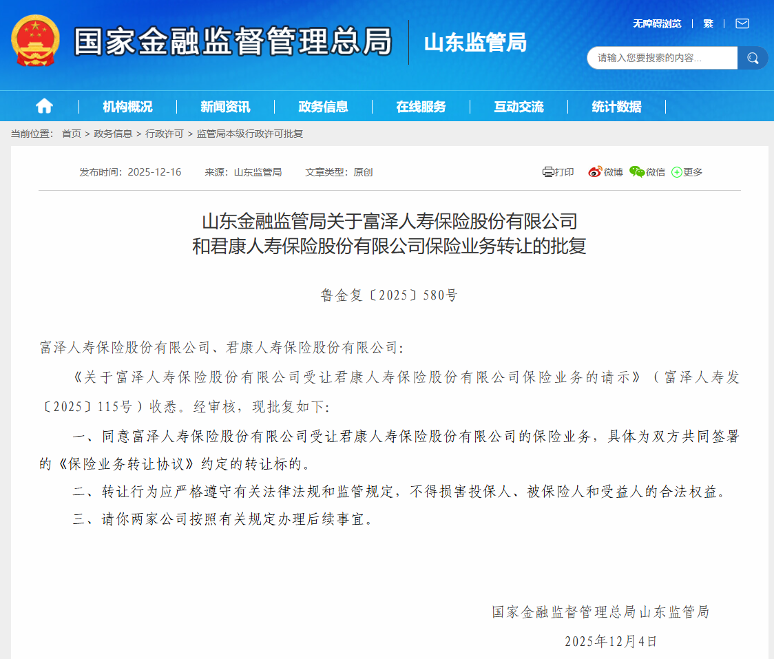 【大河财立方消息】12月16日,山东金融监管局批复,同意富泽人寿保险股份有限公司受让君康人寿保险股份有限公司的保险业务,具体为双方共同签署的《保险业务转让协议》约定的转让标的。