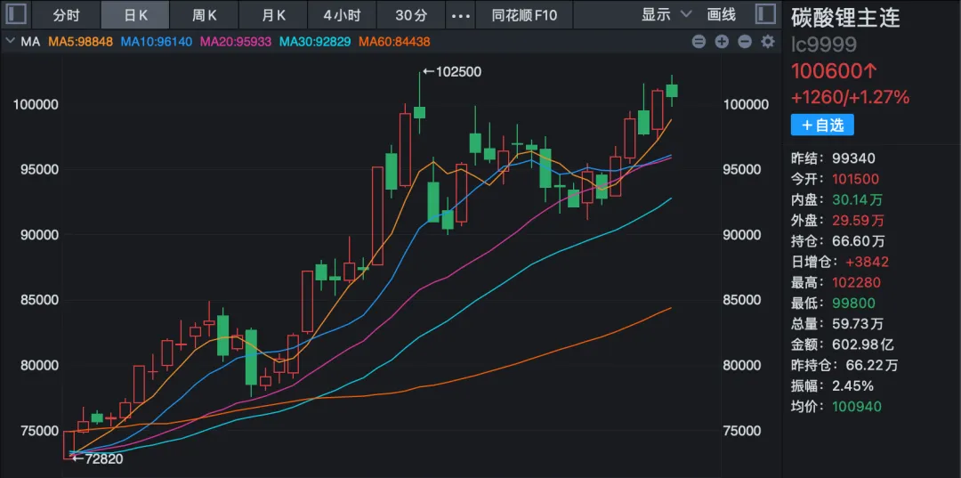 近日,碳酸锂期货价格大涨,主力合约再次站上10万元关口。