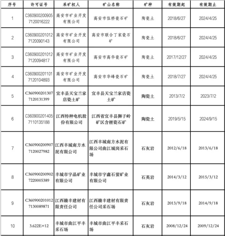 譬如,江西特种电机股份有限公司旗下江西省宜丰县狮子岭矿区含锂瓷石矿,矿种为“陶瓷土”,该矿山采矿权许可证有效期为2019年5月15日—2024年9月15日。