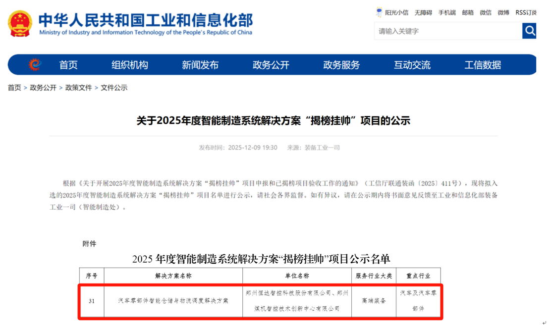 【大河财立方 记者 张战强】近日,工业和信息化部公示2025年度智能制造系统解决方案“揭榜挂帅”项目名单。中创智领集团旗下工业智能板块核心企业——郑州恒达智控科技股份有限公司的“汽车零部件智能仓储与物流调度解决方案”入选。大河财立方记者了解到,该项目是河南省入选该领域榜单的唯一代表。