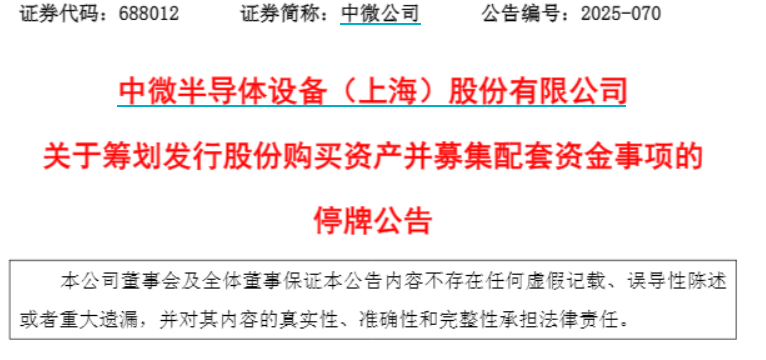 【大河财立方消息】12月18日,中微半导体设备(上海)股份有限公司(证券简称:中微公司)发布公告称,正筹划通过发行股份方式购买杭州众硅电子科技有限公司(以下简称杭州众硅)控股权并募集配套资金,公司股票将自12月19日开市起开始停牌,预计停牌时间不超过10个交易日。